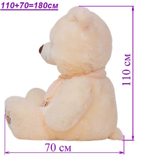 При измерении большого плюшевого мишки нужно посадить его под углом 90 градусов, измерить рулеткой расстояние от макушки до хвоста, затем от хвоста до кончика лапы, а после прибавить результаты измерений.